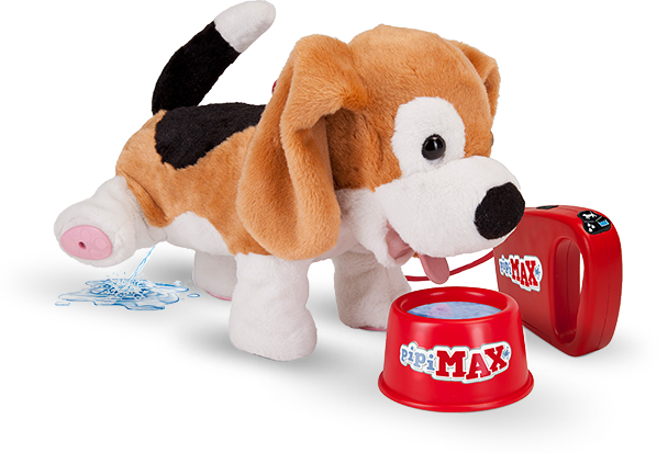 Pipi-Max ist der einzige mechanische Plüschhund der Welt, der trinken, laufen, bellen und Pipi machen kann. So sammeln Kinder ab 3 Jahren spielerisch wertvolle Erfahrungen und lernen zudem, den süßen Vierbeiner liebevoll zu pflegen.